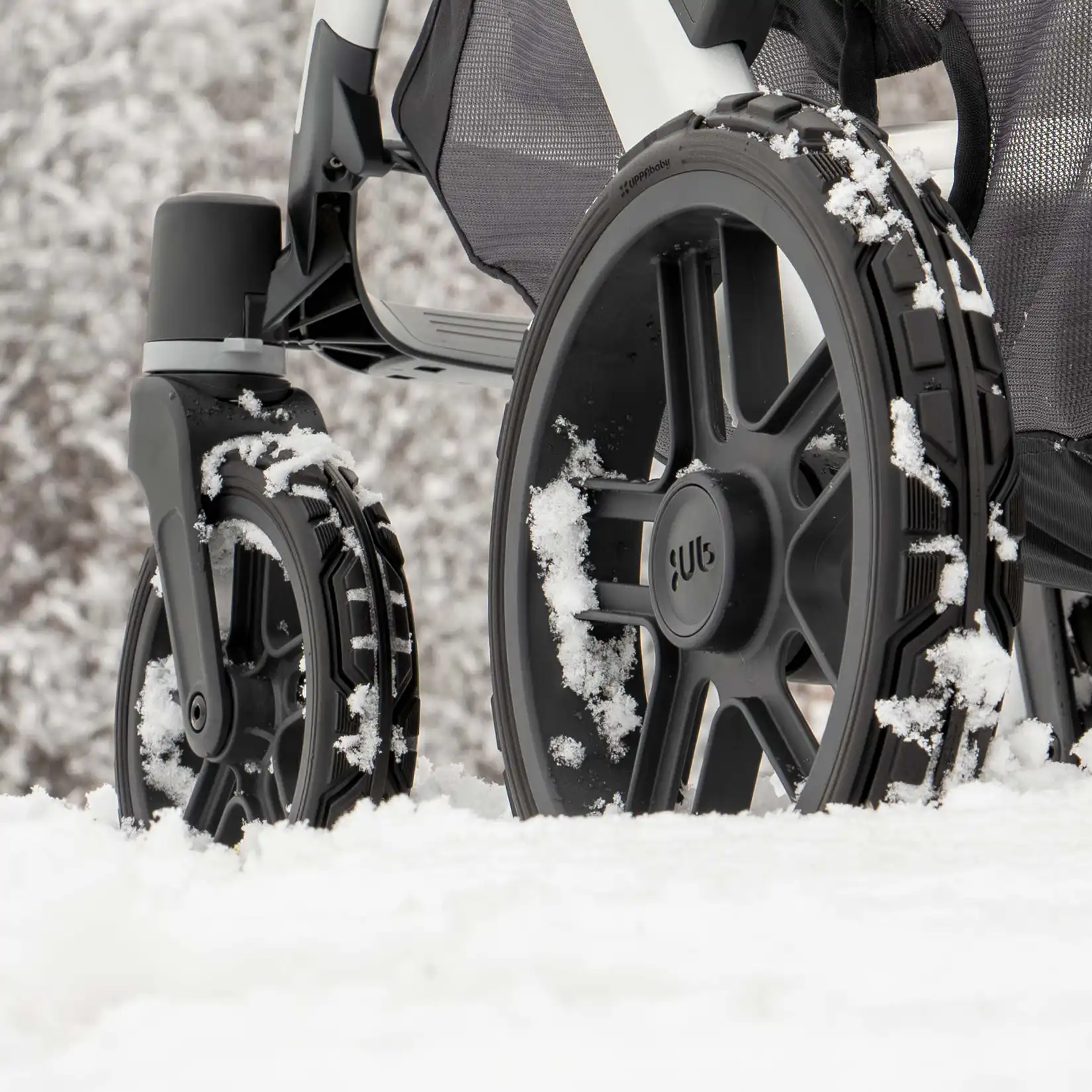 Upgrade your wheels and tackle dirt, gravel, and snow with deeper tread and shock-absorbing, never-flat wheels. No tools required!
